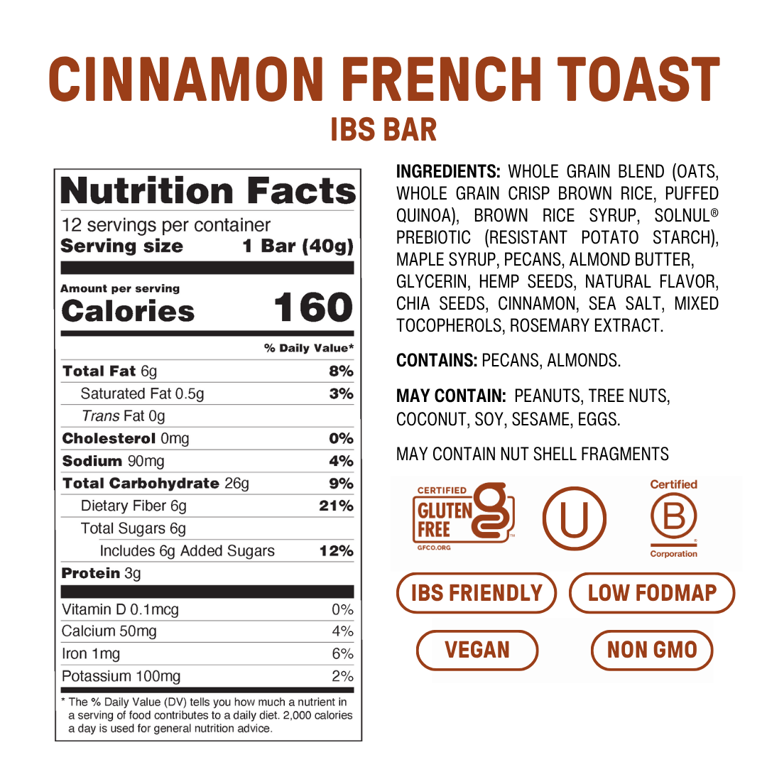Made with Gentle Prebiotic fiber, this Low FODMAP snack bar supports regularity and promotes digestive comfort in every bite.