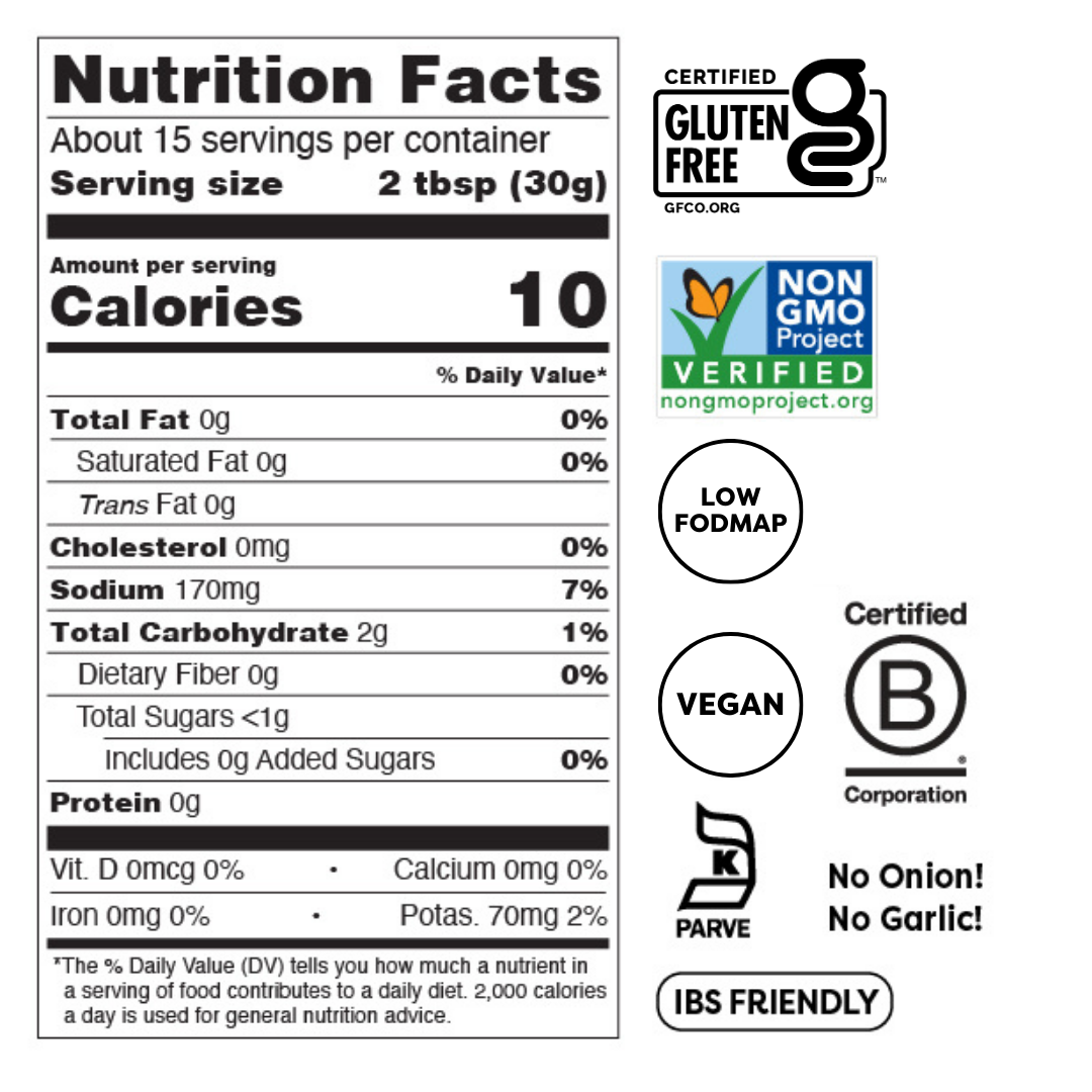 Turn up the flavor with our Medium Salsa — a zesty, IBS friendly blend made with fresh, premium ingredients and no onion or garlic. This Low FODMAP, gluten-free, vegan, non-GMO, and kosher salsa was crafted specifically for those with sensitive digestive systems who won't sacrifice on amazing taste.